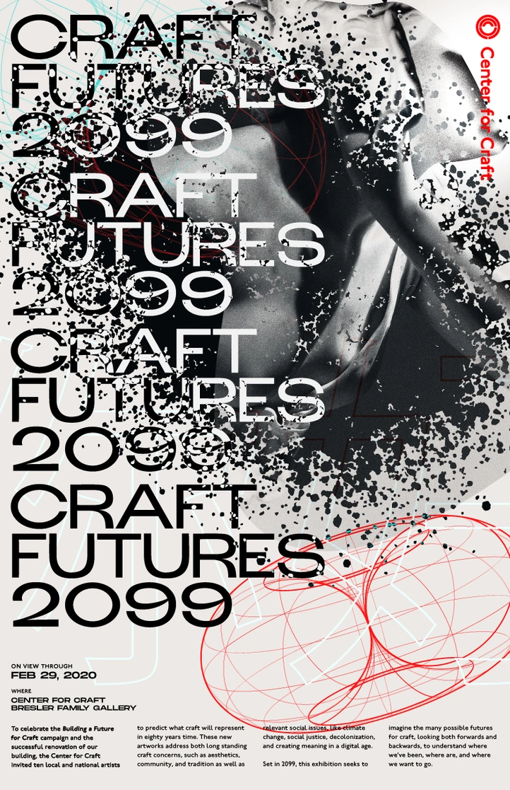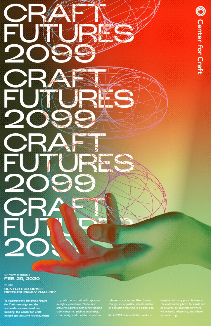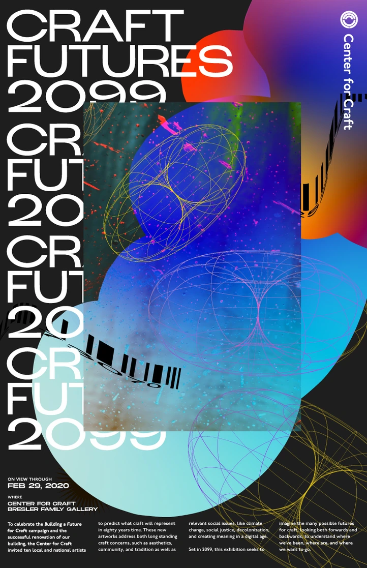 The Center for Craft is a catalyze for craft communities, and work to amplify craft's impact in the United States. Nicole was one of the three designers that took on the mighty task of redesigning their website back in 2019. As well as designing signage after their building remodel, and the branding for their opening exhibition: Craft Futures 2099. Craft Futures 2099 challenged makers to envision what the field of craft will be in the distant future.